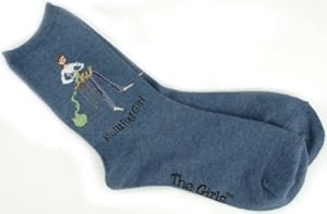 Product Description :  : K BELL-These socks are adorable! Each sock features a girl crafting something. For example the knitting girl sits on a chair and knits-the yarn ball is actually made of yarn so it looks 3 dimensional! Sock size: 9-11. The socks are made of 60% cotton 38% polyester and 2% spandex. Each sock has the word underneath the icon: for example Knitting Girl sock says Knitting Girl beneath the girl knitting. On the foot part of the sock it says The Girls. Socks measure 14.8 long.